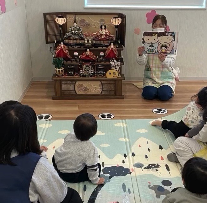 お雛様の前で紙芝居を読んでもらいきれいな着物をきたお雛様に目がキラキラ⭐️